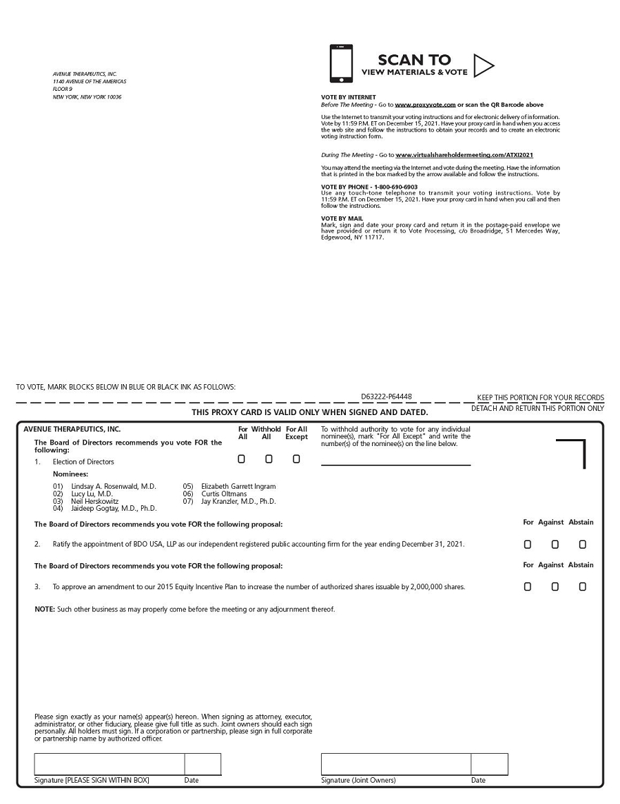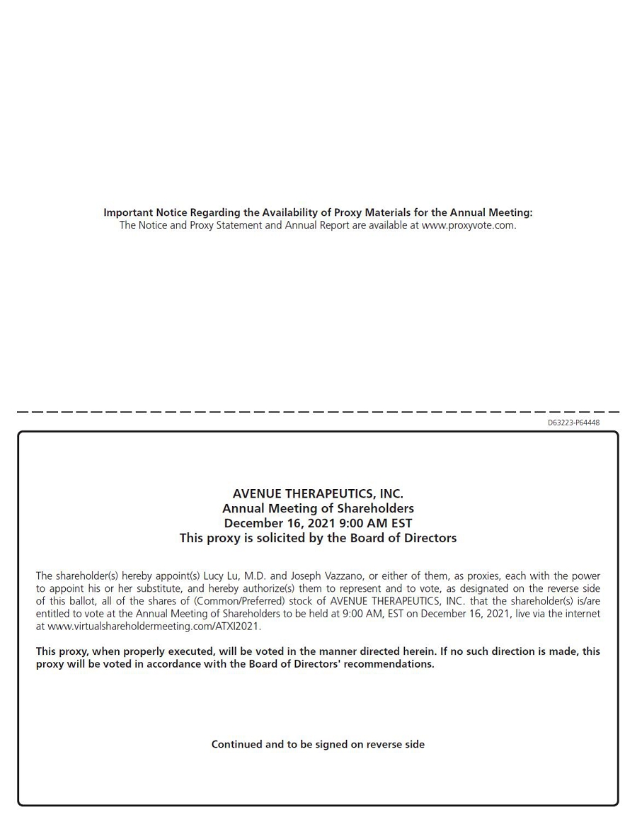 Important Notice Regarding the Availability of Proxy Materials for the Annual Meeting: The Notice and Proxy Statement and Annual Report are available at www.proxyvote.com. D63223-P64448 AVENUE THERAPEUTICS, INC. Annual Meeting of Shareholders December 16, 2021 9:00 AM EST This proxy is solicited by the Board of Directors The shareholder(s) hereby appoint(s) Lucy Lu, M.D. and Joseph Vazzano, or either of them, as proxies, each with the power to appoint his or her substitute, and hereby authorize(s) them to represent and to vote, as designated on the reverse side of this ballot, all of the shares of (Common/Preferred) stock of AVENUE THERAPEUTICS, INC. that the shareholder(s) is/are entitled to vote at the Annual Meeting of Shareholders to be held at 9:00 AM, EST on December 16, 2021, live via the internet at www.virtualshareholdermeeting.com/ATXI2021. This proxy, when properly executed, will be voted in the manner directed herein. If no such direction is made, this proxy will be voted in accordance with the Board of Directors' recommendations. Continued and to be signed on reverse side