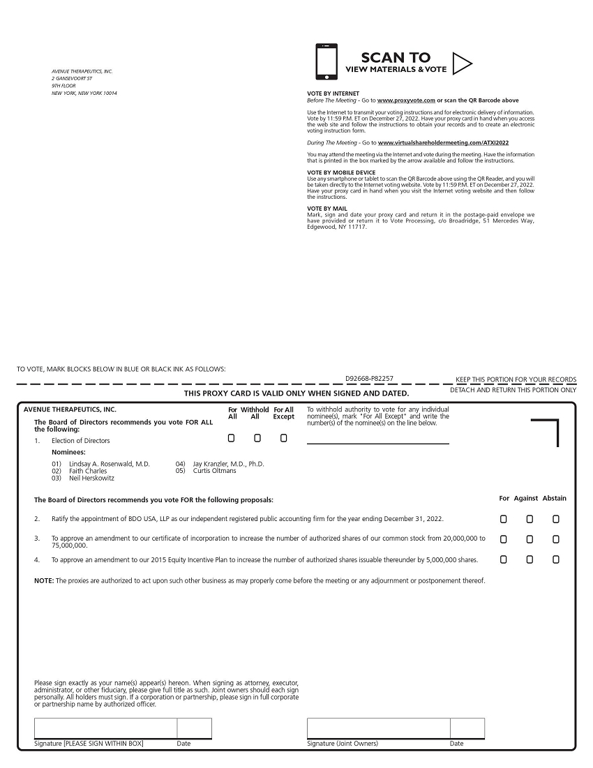 Signature [PLEASE SIGN WITHIN BOX] Date Signature (Joint Owners) Date TO VOTE, MARK BLOCKS BELOW IN BLUE OR BLACK INK AS FOLLOWS: KEEP THIS PORTION FOR YOUR RECORDS THIS PROXY CARD IS VALID ONLY WHEN SIGNED AND DATED. DETACH AND RETURN THIS PORTION ONLY D92668-P82257 01) Lindsay A. Rosenwald, M.D. 02) Faith Charles 03) Neil Herskowitz 04) Jay Kranzler, M.D., Ph.D. 05) Curtis Oltmans 2. Ratify the appointment of BDO USA, LLP as our independent registered public accounting firm for the year ending December 31, 2022. 4. To approve an amendment to our 2015 Equity Incentive Plan to increase the number of authorized shares issuable thereunder by 5,000,000 shares. 3. To approve an amendment to our certificate of incorporation to increase the number of authorized shares of our common stock from 20,000,000 to 75,000,000. NOTE: The proxies are authorized to act upon such other business as may properly come before the meeting or any adjournment or postponement thereof. Please sign exactly as your name(s) appear(s) hereon. When signing as attorney, executor, administrator, or other fiduciary, please give full title as such. Joint owners should each sign personally. All holders must sign. If a corporation or partnership, please sign in full corporate or partnership name by authorized officer. The Board of Directors recommends you vote FOR the following proposals: 1. Election of Directors ! ! ! Nominees: For All Withhold All For All Except For Against Abstain AVENUE THERAPEUTICS, INC. To withhold authority to vote for any individual nominee(s), mark "For All Except" and write the The Board of Directors recommends you vote FOR ALL number(s) of the nominee(s) on the line below. the following: AVENUE THERAPEUTICS, INC. 2 GANSEVOORT ST 9TH FLOOR NEW YORK, NEW YORK 10014 ! ! ! ! ! ! ! ! ! VOTE BY INTERNET Before The Meeting - Go to www.proxyvote.com or scan the QR Barcode above Use the Internet to transmit your voting instructions and for electronic delivery of information. Vote by 11:59 P.M. ET on December 27, 2022. Have your proxy card in hand when you access the web site and follow the instructions to obtain your records and to create an electronic voting instruction form. During The Meeting - Go to www.virtualshareholdermeeting.com/ATXI2022 You may attend the meeting via the Internet and vote during the meeting. Have the information that is printed in the box marked by the arrow available and follow the instructions. VOTE BY MOBILE DEVICE Use any smartphone or tablet to scan the QR Barcode above using the QR Reader, and you will be taken directly to the Internet voting website. Vote by 11:59 P.M. ET on December 27, 2022. Have your proxy card in hand when you visit the Internet voting website and then follow the instructions. VOTE BY MAIL Mark, sign and date your proxy card and return it in the postage-paid envelope we have provided or return it to Vote Processing, c/o Broadridge, 51 Mercedes Way, Edgewood, NY 11717. SCAN TO VIEW MATERIALS & VOTE w