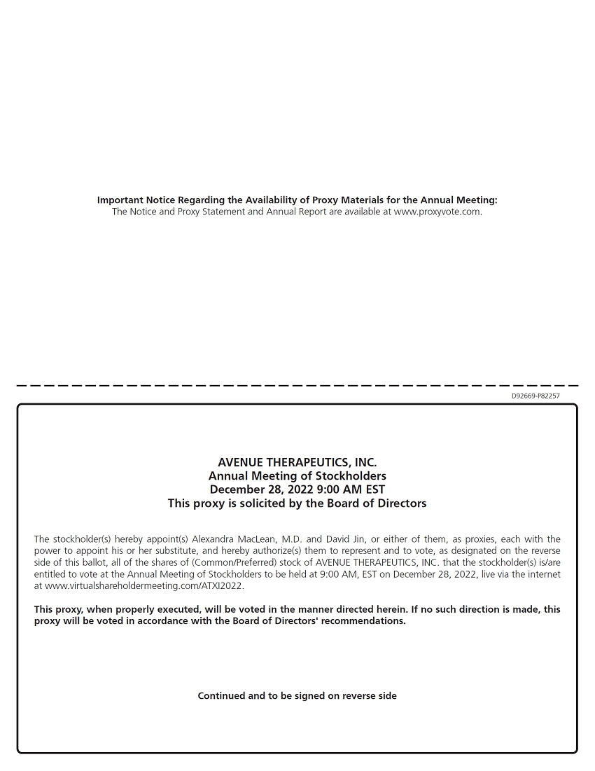 Important Notice Regarding the Availability of Proxy Materials for the Annual Meeting: The Notice and Proxy Statement and Annual Report are available at www.proxyvote.com. D92669-P82257 AVENUE THERAPEUTICS, INC. Annual Meeting of Stockholders December 28, 2022 9:00 AM EST This proxy is solicited by the Board of Directors The stockholder(s) hereby appoint(s) Alexandra MacLean, M.D. and David Jin, or either of them, as proxies, each with the power to appoint his or her substitute, and hereby authorize(s) them to represent and to vote, as designated on the reverse side of this ballot, all of the shares of (Common/Preferred) stock of AVENUE THERAPEUTICS, INC. that the stockholder(s) is/are entitled to vote at the Annual Meeting of Stockholders to be held at 9:00 AM, EST on December 28, 2022, live via the internet at www.virtualshareholdermeeting.com/ATXI2022. This proxy, when properly executed, will be voted in the manner directed herein. If no such direction is made, this proxy will be voted in accordance with the Board of Directors' recommendations. Continued and to be signed on reverse side