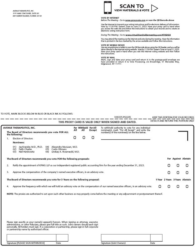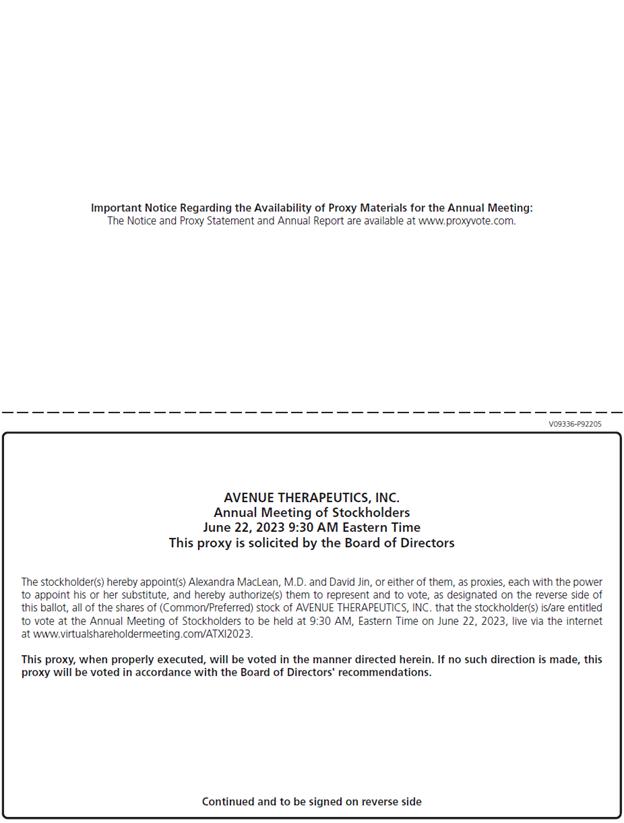 You are cordially invited to the Annual Meeting of Stockholders (the “Annual Meeting”) of Avenue Therapeutics, Inc. (“Avenue” or the “Company”), to be held virtually at 9:30 a.m. Eastern Time, on Thursday, June 22, 2023. The Annual Meeting can be accessed by visiting www.virtualshareholdermeeting.com/ATXI2023, where you will be able to listen to the meeting live, submit questions and vote online. At the Annual Meeting, the stockholders will be asked to (i) elect six directors for a term of one year until our 2024 Annual Meeting of Stockholders or until their successors are duly elected and qualified in accordance with our Second Amended and Restated Bylaws (“Bylaws”), (ii) ratifying the appointment of KPMG LLP as our independent registered public accounting firm for the year ending December 31, 2023, (iii) approve the compensation of our named executive officers, in an advisory vote, (iv) approve the frequency with which we will hold an advisory vote on the compensation of our named executive officers, in an advisory vote, and (v) transact any other business that may properly come before the Annual Meeting or any postponement or adjournment of the Annual Meeting. You will also have the opportunity to ask questions at the meeting.