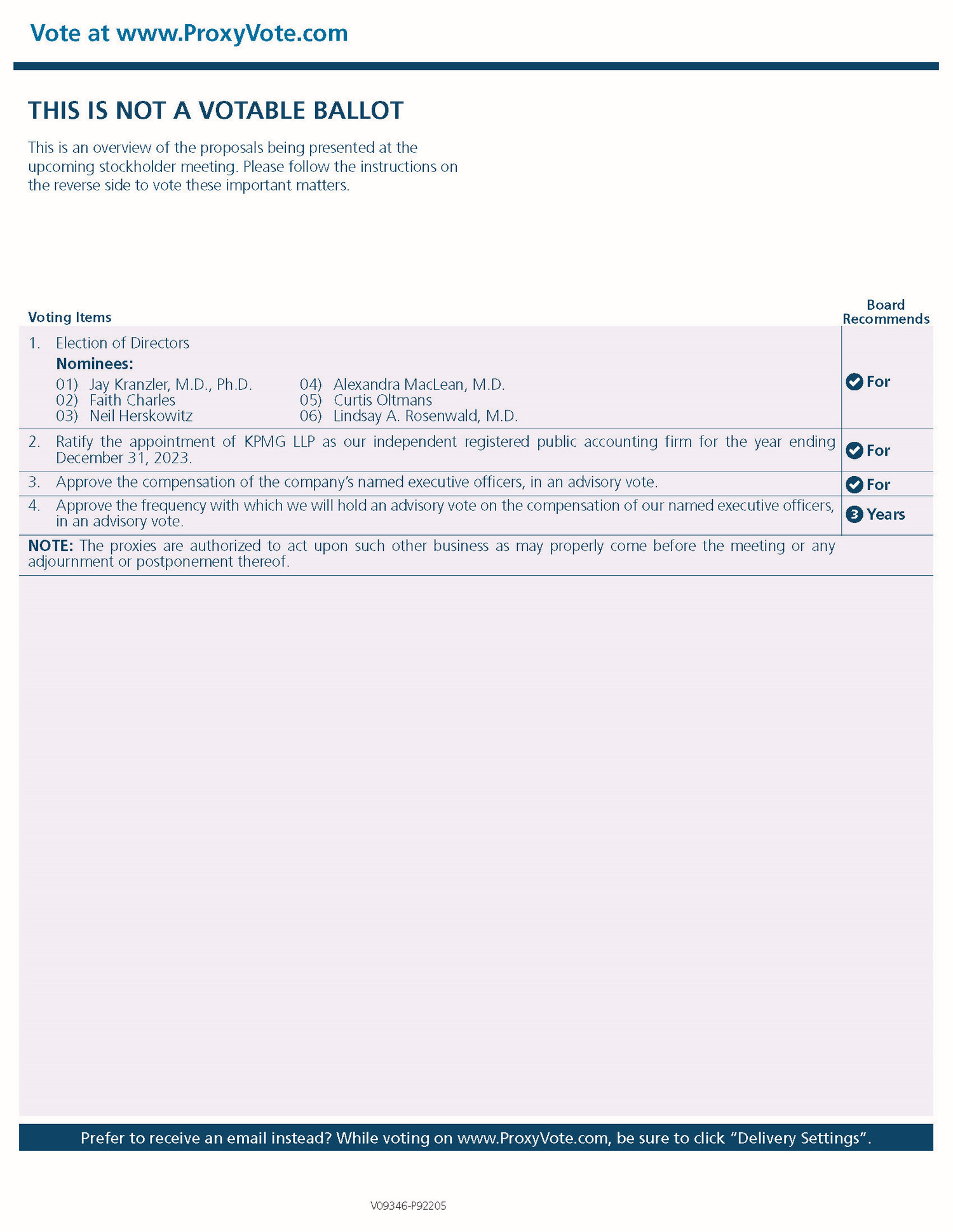 THIS IS NOT A VOTABLE BALLOT This is an overview of the proposals being presented at the upcoming stockholder meeting. Please follow the instructions on the reverse side to vote these important matters. Vote at www.ProxyVote.com Prefer to receive an email instead? While voting on www.ProxyVote.com, be sure to click “Delivery Settings”. Voting Items Board Recommends V09346-P92205 3 Years 01) Jay Kranzler, M.D., Ph.D. 02) Faith Charles 03) Neil Herskowitz 04) Alexandra MacLean, M.D. 05) Curtis Oltmans 06) Lindsay A. Rosenwald, M.D. 1. Election of Directors Nominees: 2. Ratify the appointment of KPMG LLP as our independent registered public accounting firm for the year ending December 31, 2023. 3. Approve the compensation of the company’s named executive officers, in an advisory vote. 4. Approve the frequency with which we will hold an advisory vote on the compensation of our named executive officers, in an advisory vote. NOTE: The proxies are authorized to act upon such other business as may properly come before the meeting or any adjournment or postponement thereof. For For For