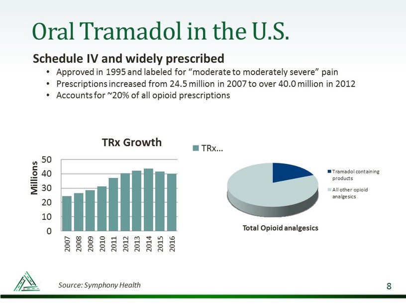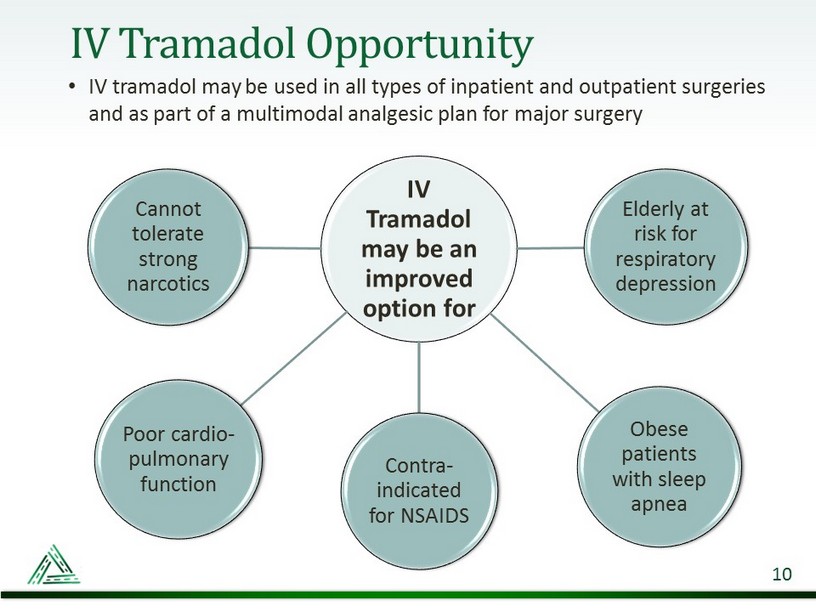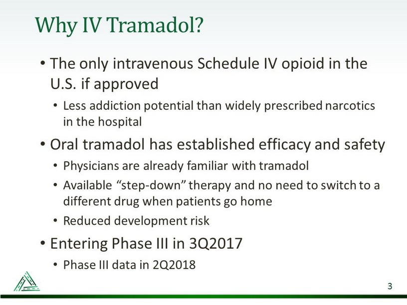 Why IV Tramadol? • The only intravenous Schedule IV opioid in the U.S. if approved • Less addiction potential than widely prescribed narcotics in the hospital • Oral tramadol has established efficacy and safety • Physicians are already familiar with tramadol • Available “step - down” therapy and no need to switch to a different drug when patients go home • Reduced development risk • Entering Phase III in 3Q2017 • Phase III data in 2Q2018 3