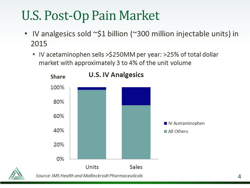 U.S. Post - Op Pain Market • IV analgesics sold ~$1 billion (~300 million injectable units) in 2015 • IV acetaminophen sells >$250MM per year: >25% of total dollar market with approximately 3 to 4% of the unit volume 4 0% 20% 40% 60% 80% 100% Units Sales U.S. IV Analgesics IV Acetaminophen All Others Share Source: IMS Health and Mallinckrodt Pharmaceuticals