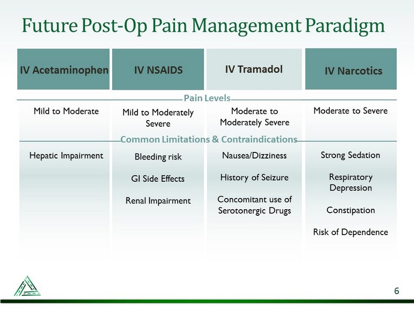 Mild to Moderate Hepatic Impairment Mild to Moderately Severe Bleeding risk GI Side Effects Renal Impairment Moderate to Severe Strong Sedation Respiratory Depression Constipation Risk of Dependence Future Post - Op Pain Management Paradigm IV Acetaminophen IV NSAIDS IV Narcotics Pain Levels 6 Moderate to Moderately Severe Nausea/Dizziness History of Seizure Concomitant use of Serotonergic Drugs Common Limitations & Contraindications IV Tramadol