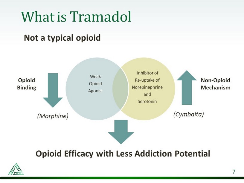 What is Tramadol Not a typical opioid 7 Inhibitor of Re - uptake of Norepinephrine and Serotonin Weak Opioid Agonist Opioid Binding Non - Opioid Mechanism Opioid Efficacy with Less Addiction Potential (Cymbalta) (Morphine)