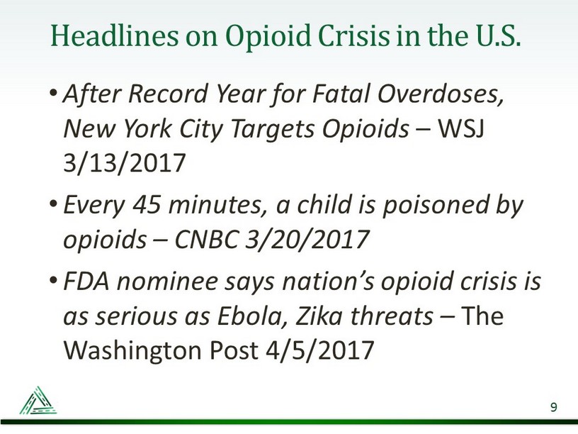 Oral Tramadol in the U.S. Schedule IV and widely prescribed • Approved in 1995 and labeled for “moderate to moderately severe” pain • Prescriptions increased from 24.5 million in 2007 to over 40.0 million in 2012 • Accounts for ~20% of all opioid prescriptions 8 0 10 20 30 40 50 2007 2008 2009 2010 2011 2012 2013 2014 2015 2016 Millions TRx Growth TRx… Total Opioid analgesics Tramadol containing products All other opioid analgesics Source: Symphony Health