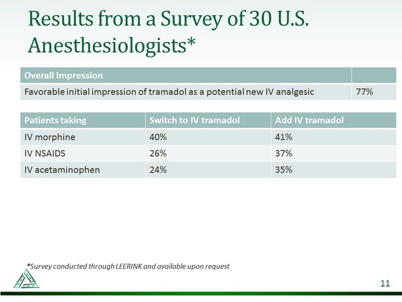IV Tramadol Opportunity • IV tramadol may be used in all types of inpatient and outpatient surgeries and as part of a multimodal analgesic plan for major surgery 10 IV Tramadol may be an improved option for Contra - indicated for NSAIDS Elderly at risk for respiratory depression Obese patients with sleep apnea Poor cardio - pulmonary function Cannot tolerate strong narcotics