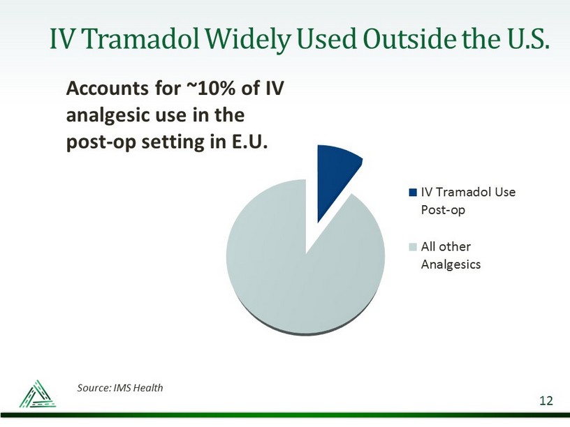 Results from a Survey of 30 U.S. Anesthesiologists* 11 * Survey conducted through LEERINK and available upon request Patients taking Switch to IV tramadol Add IV tramadol IV morphine 40% 41% IV NSAIDS 26% 37% IV acetaminophen 24% 35% Overall Impression Favorable initial impression of tramadol as a potential new IV analgesic 77%