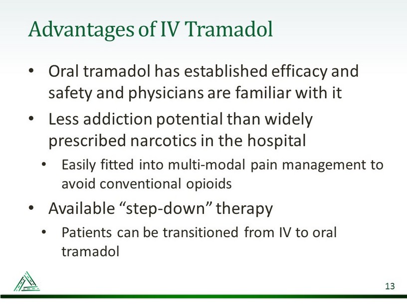 IV Tramadol Widely Used Outside the U.S. Accounts for ~10% of IV analgesic use in the post - op setting in E.U. 12 IV Tramadol Use Post-op All other Analgesics Source: IMS Health