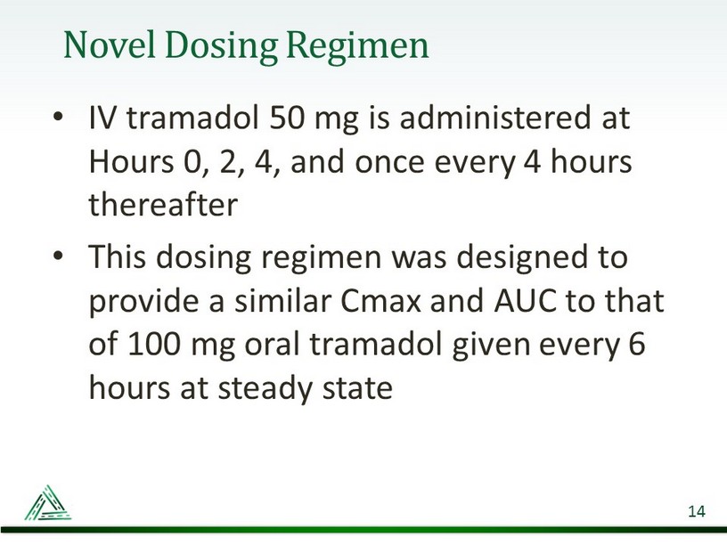 Advantages of IV Tramadol • Oral tramadol has established efficacy and safety and physicians are familiar with it • Less addiction potential than widely prescribed narcotics in the hospital • Easily fitted into multi - modal pain management to avoid conventional opioids • Available “step - down” therapy • Patients can be transitioned from IV to oral tramadol 13