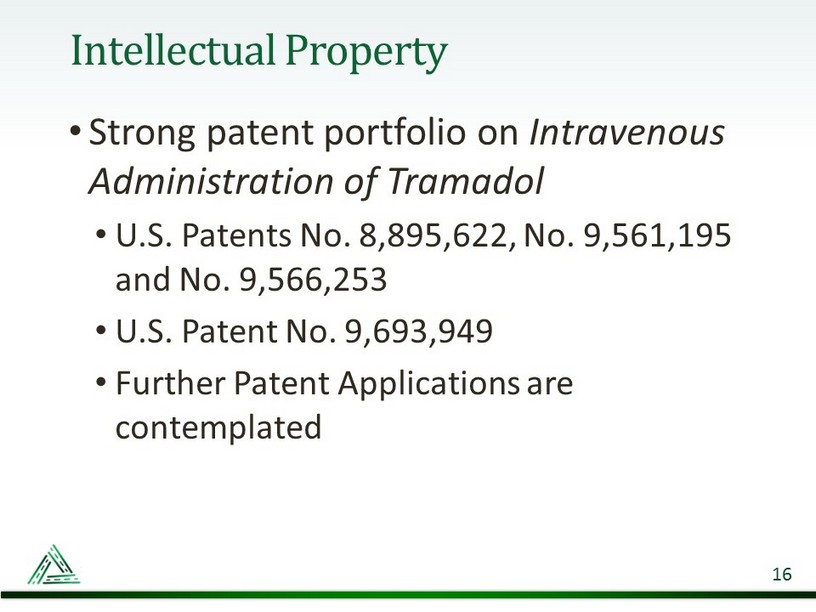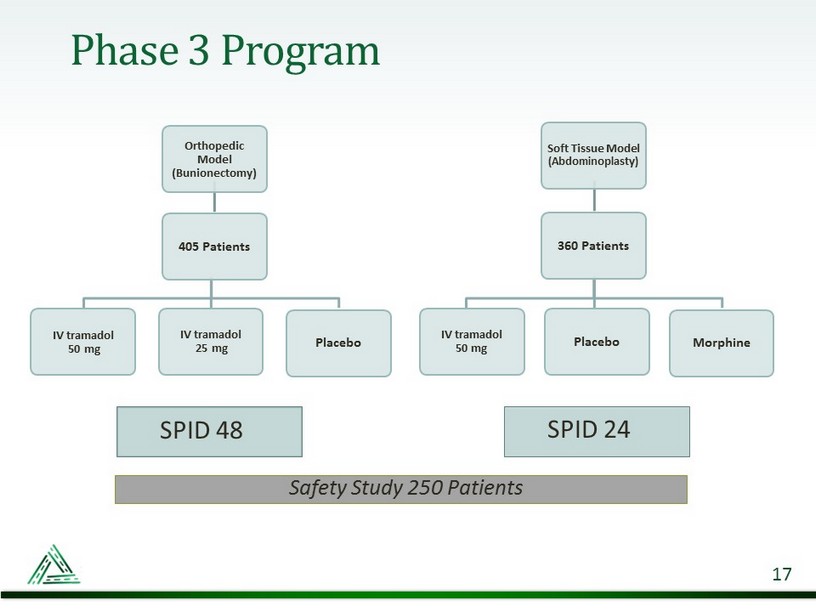 Intellectual Property • Strong patent portfolio on Intravenous Administration of Tramadol • U.S. Patents No. 8,895,622, No. 9,561,195 and No. 9,566,253 • U.S. Patent No. 9,693,949 • Further Patent Applications are contemplated 16
