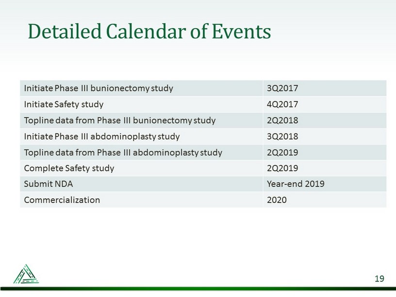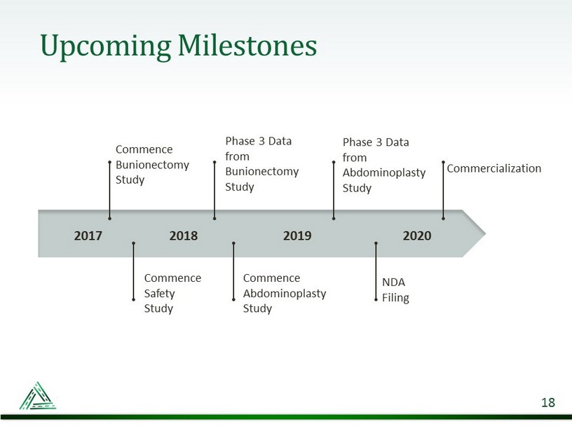 Upcoming Milestones 18 2017 2018 2019 Commence Bunionectomy Study Commence Safety Study Commence Abdominoplasty Study Commercialization 2020 Phase 3 Data from Bunionectomy Study NDA Filing Phase 3 Data from Abdominoplasty Study
