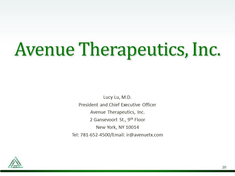 Lucy Lu, M.D. President and Chief Executive Officer Avenue Therapeutics, Inc. 2 Gansevoort St., 9 th Floor New York, NY 10014 Tel: 781 - 652 - 4500/Email: ir@avenuetx.com 20 Avenue Therapeutics, Inc.