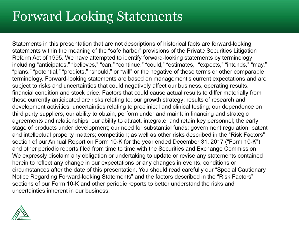 Forward Looking Statements Statements in this presentation that are not descriptions of historical facts are forward - looking statements within the meaning of the “safe harbor” provisions of the Private Securities Litigation Reform Act of 1995. We have attempted to identify forward - looking statements by terminology including “anticipates,” “believes,” “can,” “continue,” “could,” “estimates,” “expects,” “intends,” “may,” “plans,” “potential,” “predicts,” “should,” or “will” or the negative of these terms or other comparable terminology. Forward - looking statements are based on management’s current expectations and are subject to risks and uncertainties that could negatively affect our business, operating results, financial condition and stock price. Factors that could cause actual results to differ materially from those currently anticipated are risks relating to: our growth strategy; results of research and development activities; uncertainties relating to preclinical and clinical testing; our dependence on third party suppliers; our ability to obtain, perform under and maintain financing and strategic agreements and relationships; our ability to attract, integrate, and retain key personnel; the early stage of products under development; our need for substantial funds; government regulation; patent and intellectual property matters; competition; as well as other risks described in the “Risk Factors” section of our Annual Report on Form 10 - K for the year ended December 31, 2017 (“Form 10 - K”) and other periodic reports filed from time to time with the Securities and Exchange Commission. We expressly disclaim any obligation or undertaking to update or revise any statements contained herein to reflect any change in our expectations or any changes in events, conditions or circumstances after the date of this presentation. You should read carefully our “Special Cautionary Notice Regarding Forward - looking Statements” and the factors described in the “Risk Factors” sections of our Form 10 - K and other periodic reports to better understand the risks and uncertainties inherent in our business.
