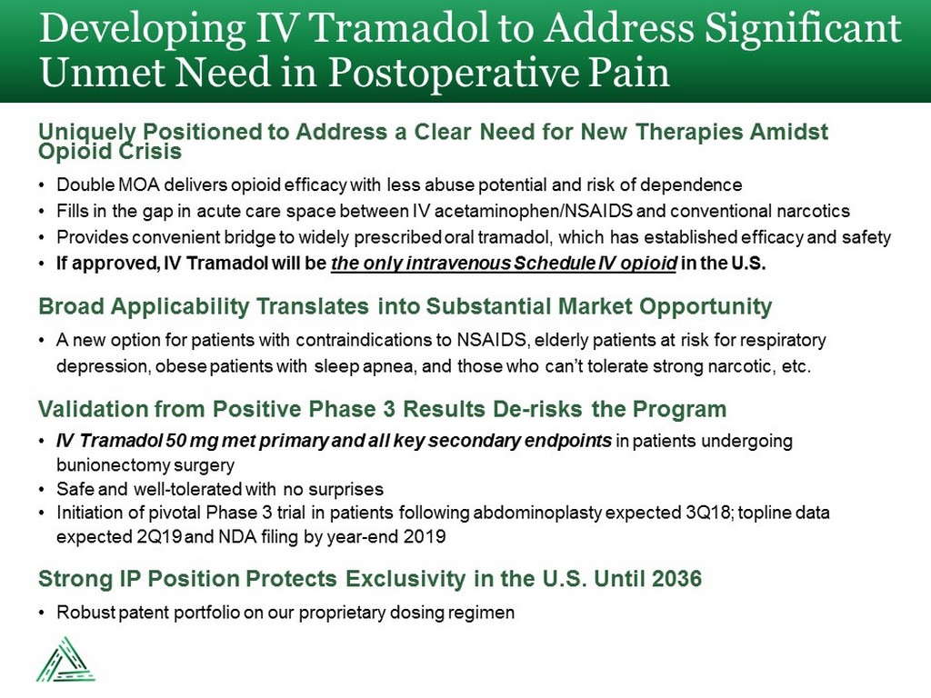 Developing IV Tramadol to Address Significant Unmet Need in Postoperative Pain Uniquely Positioned to Address a Clear Need for New Therapies Amidst Opioid Crisis • Double MOA delivers opioid efficacy with less abuse potential and risk of dependence • Fills in the gap in acute care space between IV acetaminophen/NSAIDS and conventional narcotics • Provides convenient bridge to widely prescribed oral tramadol, which has established efficacy and safety • If approved, IV Tramadol will be the only intravenous Schedule IV opioid in the U.S. Broad Applicability Translates into Substantial Market Opportunity • A new option for patients with contraindications to NSAIDS, elderly patients at risk for respiratory depression, obese patients with sleep apnea, and those who can’t tolerate strong narcotic, etc. Validation from Positive Phase 3 Results De - risks the Program • IV Tramadol 50 mg met primary and all key secondary endpoints in patients undergoing bunionectomy surgery • Safe and well - tolerated with no surprises • Initiation of pivotal Phase 3 trial in patients following abdominoplasty expected 3Q18; topline data expected 2Q19 and NDA filing by year - end 2019 Strong IP Position Protects Exclusivity in the U.S. Until 2036 • Robust patent portfolio on our proprietary dosing regimen