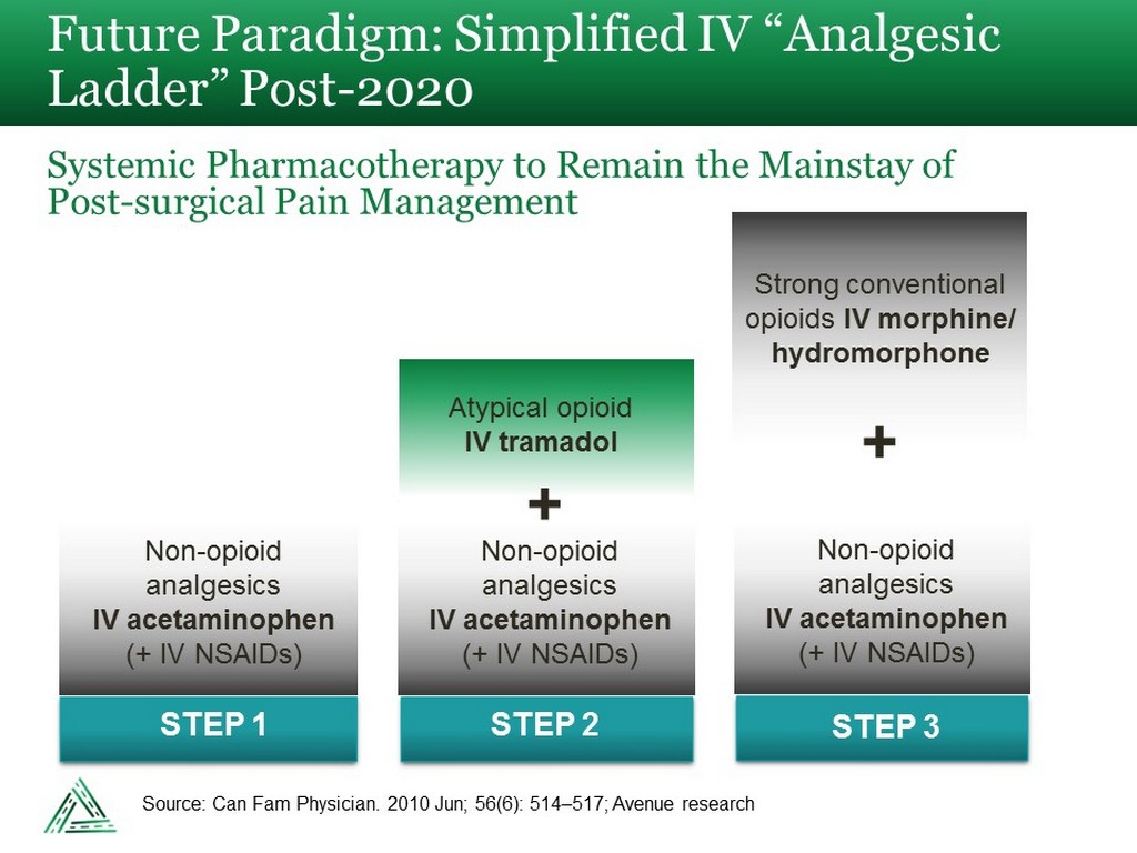 Future Paradigm: Simplified IV “Analgesic Ladder” Post - 2020 Systemic Pharmacotherapy to Remain the Mainstay of Post - surgical Pain Management STEP 1 STEP 2 Non - opioid analgesics IV acetaminophen (+ IV NSAIDs) Atypical opioid IV tramadol + + Strong conventional opioids IV morphine/ hydromorphone STEP 3 Non - opioid analgesics IV acetaminophen (+ IV NSAIDs) Non - opioid analgesics IV acetaminophen (+ IV NSAIDs) Source: Can Fam Physician. 2010 Jun; 56(6): 514 – 517; Avenue research