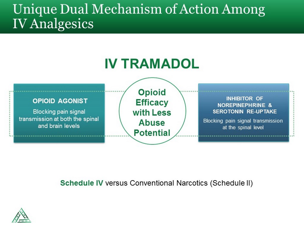 Unique Dual Mechanism of Action Among IV Analgesics IV TRAMADOL Blocking pain signal transmission at both the spinal and brain levels OPIOID AGONIST Blocking pain signal transmission at the spinal level INHIBITOR OF NOREPINEPHRINE & SEROTONIN RE - UPTAKE Opioid Efficacy with Less Abuse Potential Schedule IV versus Conventional Narcotics (Schedule II)