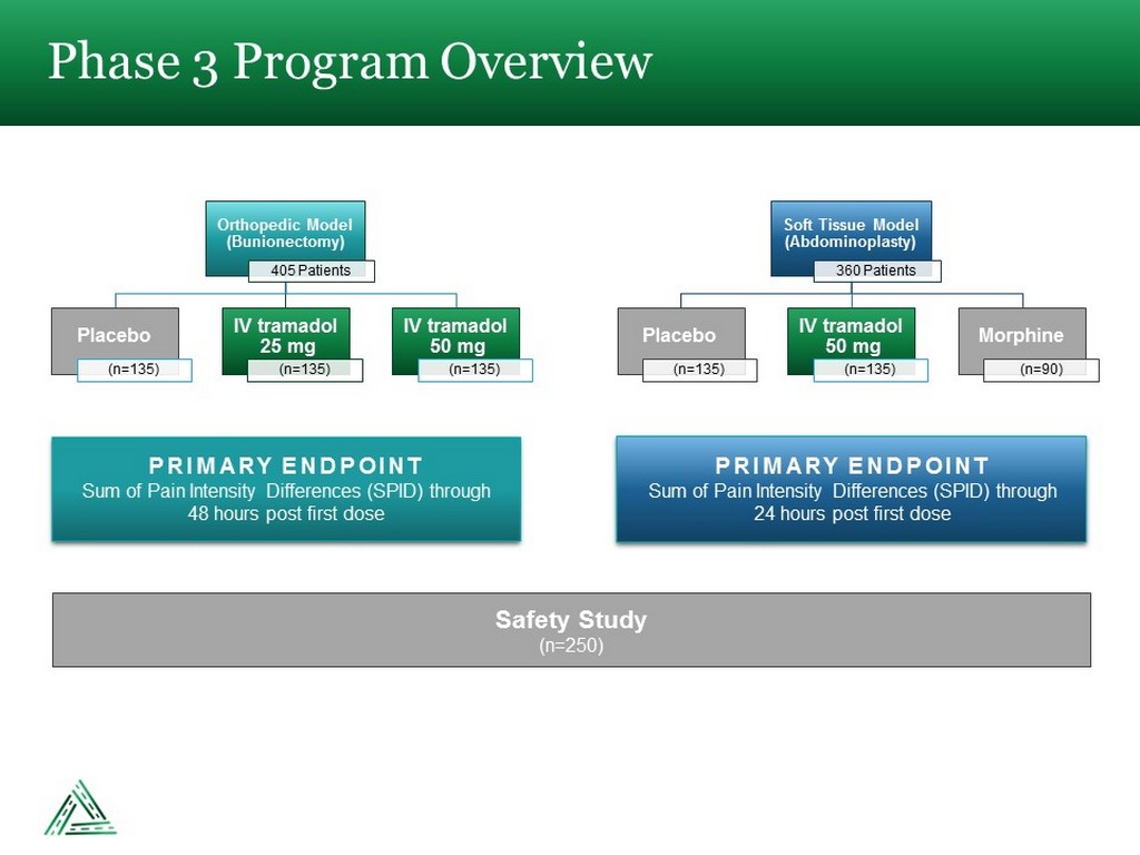 Phase 3 Program Overview Orthopedic Model (Bunionectomy) 405 Patients Placebo (n=135) IV tramadol 25 mg (n=135) IV tramadol 50 mg (n=135) Soft Tissue Model (Abdominoplasty) 360 Patients Placebo (n=135) IV tramadol 50 mg (n=135) Morphine (n=90) PRIMARY ENDPOINT Sum of Pain Intensity Differences (SPID) through 48 hours post first dose PRIMARY ENDPOINT Sum of Pain Intensity Differences (SPID) through 24 hours post first dose Safety Study (n=250)