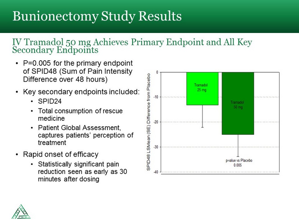 • P=0.005 for the primary endpoint of SPID48 (Sum of Pain Intensity Difference over 48 hours) • Key secondary endpoints included: • SPID24 • Total consumption of rescue medicine • Patient Global Assessment, captures patients’ perception of treatment • Rapid onset of efficacy • Statistically significant pain reduction seen as early as 30 minutes after dosing Bunionectomy Study Results IV Tramadol 50 mg Achieves Primary Endpoint and All Key Secondary Endpoints