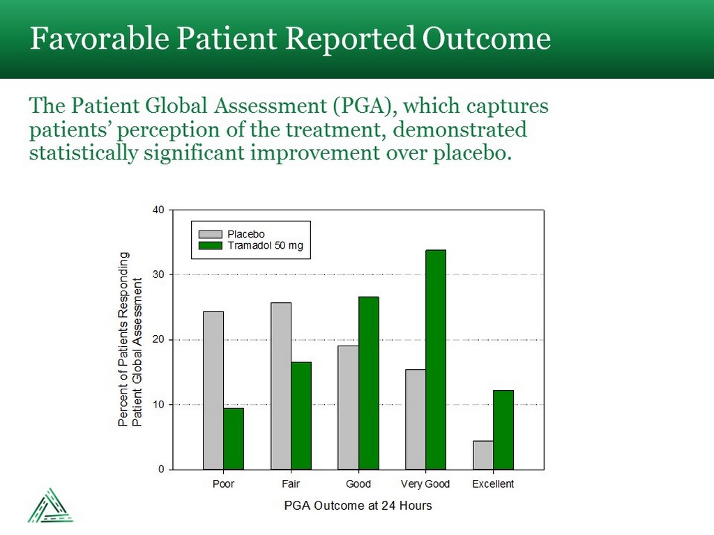 Favorable Patient Reported Outcome The Patient Global Assessment (PGA), which captures patients’ perception of the treatment, demonstrated statistically significant improvement over placebo. PGA Outcome at 24 Hours Poor Fair Good Very Good Excellent Percent of Patients RespondingPatient Global Assessment 0 10 20 30 40 Placebo Tramadol 50 mg