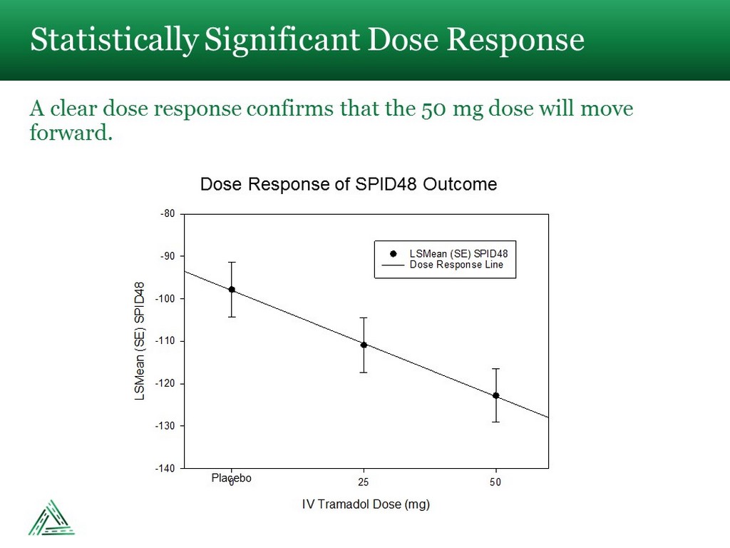 Statistically Significant Dose Response A clear dose response confirms that the 50 mg dose will move forward. IV Tramadol Dose (mg) 0 25 50 LSMean (SE) SPID48 -140 -130 -120 -110 -100 -90 -80 LSMean (SE) SPID48 Dose Response Line Placebo Dose Response of SPID48 Outcome
