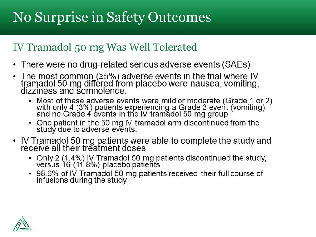 • There were no drug - related serious adverse events (SAEs) • The most common (≥5%) adverse events in the trial where IV tramadol 50 mg differed from placebo were nausea, vomiting, dizziness and somnolence. • Most of these adverse events were mild or moderate (Grade 1 or 2) with only 4 (3%) patients experiencing a Grade 3 event (vomiting) and no Grade 4 events in the IV tramadol 50 mg group • One patient in the 50 mg IV tramadol arm discontinued from the study due to adverse events. • IV Tramadol 50 mg patients were able to complete the study and receive all their treatment doses • Only 2 (1.4%) IV Tramadol 50 mg patients discontinued the study, versus 16 (11.8%) placebo patients • 98.6% of IV Tramadol 50 mg patients received their full course of infusions during the study No Surprise in Safety Outcomes IV Tramadol 50 mg Was Well Tolerated