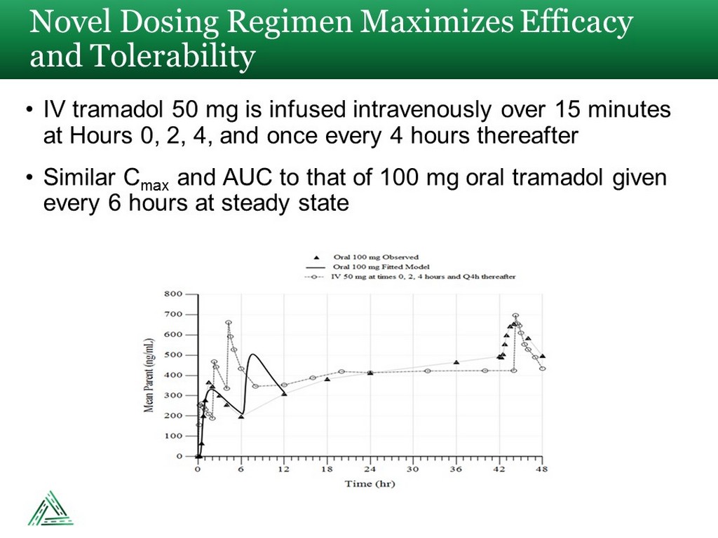 • IV tramadol 50 mg is infused intravenously over 15 minutes at Hours 0, 2, 4, and once every 4 hours thereafter • Similar C max and AUC to that of 100 mg oral tramadol given every 6 hours at steady state Novel Dosing Regimen Maximizes Efficacy and Tolerability