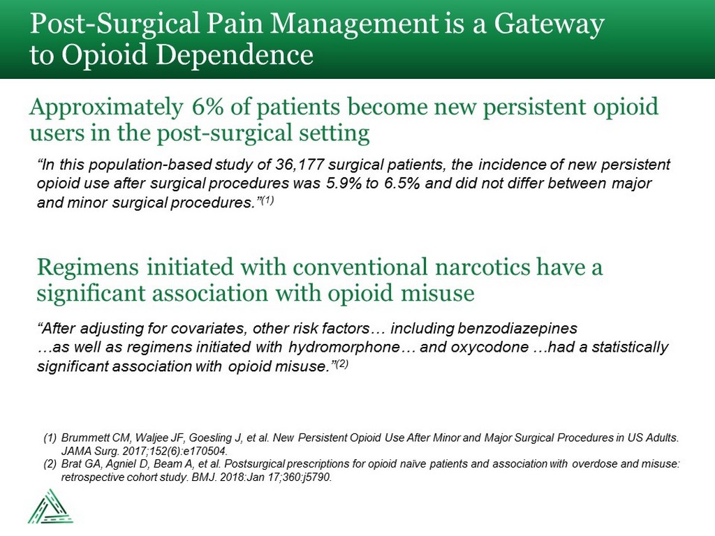 Post - Surgical Pain Management is a Gateway to Opioid Dependence Approximately 6% of patients become new persistent opioid users in the post - surgical setting “In this population - based study of 36,177 surgical patients, the incidence of new persistent opioid use after surgical procedures was 5.9% to 6.5% and did not differ between major and minor surgical procedures.” (1) “After adjusting for covariates, other risk factors… including benzodiazepines …as well as regimens initiated with hydromorphone… and oxycodone …had a statistically significant association with opioid misuse.” (2) Regimens initiated with conventional narcotics have a significant association with opioid misuse (1) Brummett CM, Waljee JF, Goesling J, et al. New Persistent Opioid Use After Minor and Major Surgical Procedures in US Adults. JAMA Surg. 2017;152(6):e170504. (2) Brat GA, Agniel D, Beam A, et al. Postsurgical prescriptions for opioid naïve patients and association with overdose and misuse: retrospective cohort study. BMJ. 2018:Jan 17;360:j5790.