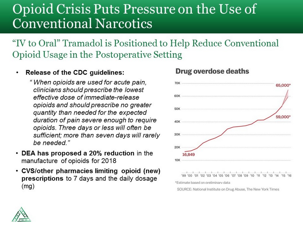 • Release of the CDC guidelines: “ When opioids are used for acute pain, clinicians should prescribe the lowest effective dose of immediate - release opioids and should prescribe no greater quantity than needed for the expected duration of pain severe enough to require opioids. Three days or less will often be sufficient; more than seven days will rarely be needed.” • DEA has proposed a 20% reduction in the manufacture of opioids for 2018 • CVS/other pharmacies limiting opioid (new) prescriptions to 7 days and the daily dosage (mg) Opioid Crisis Puts Pressure on the Use of Conventional Narcotics “IV to Oral” Tramadol is Positioned to Help Reduce Conventional Opioid Usage in the Postoperative Setting