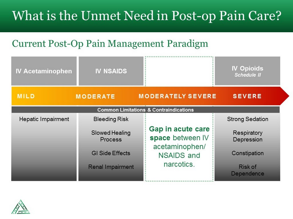 What is the Unmet Need in Post - op Pain Care? Current Post - Op Pain Management Paradigm IV Acetaminophen IV NSAIDS IV Opioids Schedule II MILD MODERATE MODERATELY SEVERE SEVERE Common Limitations & Contraindications Hepatic Impairment Bleeding Risk Slowed Healing Process GI Side Effects Renal Impairment Strong Sedation Respiratory Depression Constipation Risk of Dependence Gap in acute care space between IV acetaminophen/ NSAIDS and narcotics.