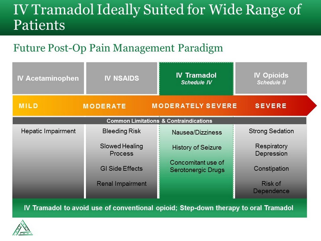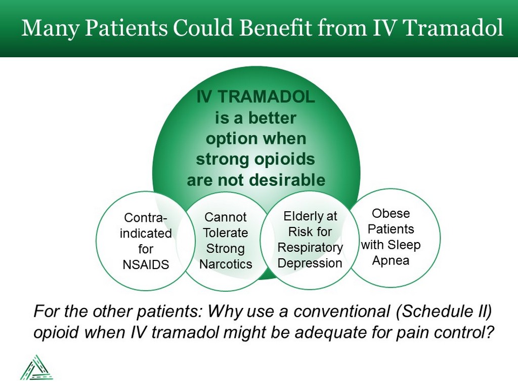 IV TRAMADOL is a better option when strong opioids are not desirable Many Patients Could Benefit from IV Tramadol Cannot Tolerate Strong Narcotics Contra - indicated for NSAIDS Obese Patients with Sleep Apnea Elderly at Risk for Respiratory Depression For the other patients: Why use a conventional (Schedule II) opioid when IV tramadol might be adequate for pain control?