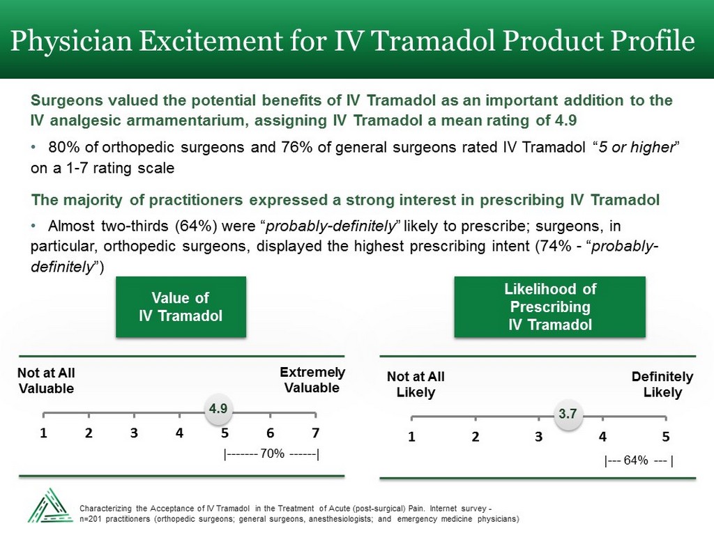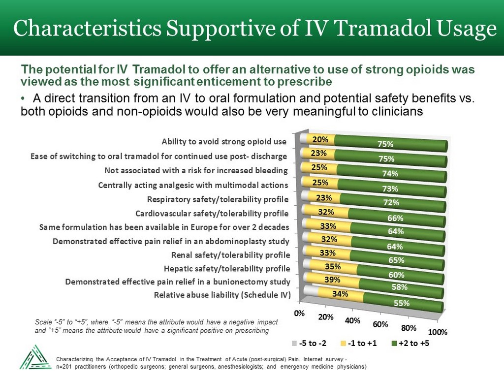 Physician Excitement for IV Tramadol Product Profile Surgeons valued the potential benefits of IV Tramadol as an important addition to the IV analgesic armamentarium, assigning IV Tramadol a mean rating of 4.9 • 80% of orthopedic surgeons and 76% of general surgeons rated IV Tramadol “ 5 or higher ” on a 1 - 7 rating scale The majority of practitioners expressed a strong interest in prescribing IV Tramadol • Almost two - thirds (64%) were “ probably - definitely ” likely to prescribe; surgeons, in particular, orthopedic surgeons, displayed the highest prescribing intent (74% - “ probably - definitely ”) 1 2 3 4 5 6 7 4.9 Not at All Valuable Extremely Valuable Value of IV Tramadol | ------- 70% ------ | 1 2 3 4 5 3.7 Not at All Likely Definitely Likely Likelihood of Prescribing IV Tramadol | --- 64% --- | Characterizing the Acceptance of IV Tramadol in the Treatment of Acute (post - surgical) Pain. Internet survey - n=201 practitioners (orthopedic surgeons; general surgeons, anesthesiologists; and emergency medicine physicians)