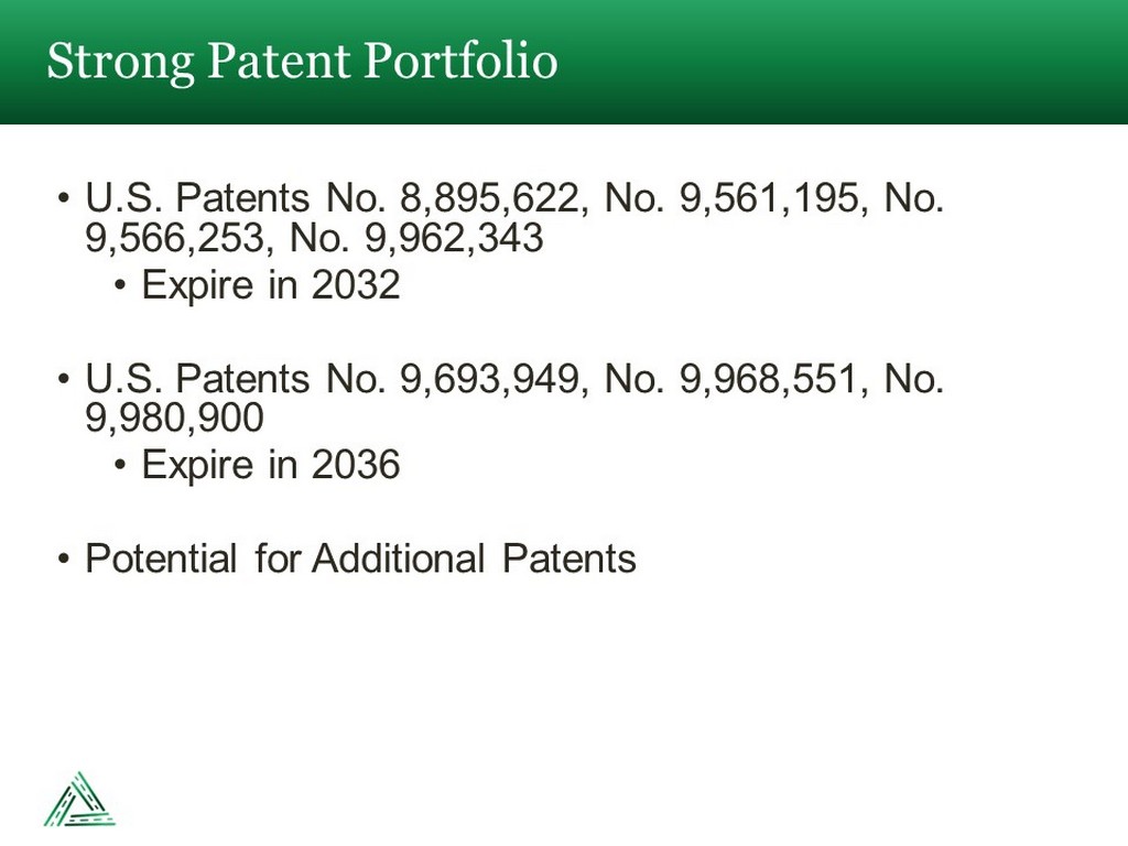 • U.S. Patents No. 8,895,622, No. 9,561,195, No. 9,566,253, No. 9,962,343 • Expire in 2032 • U.S. Patents No. 9,693,949, No. 9,968,551, No. 9,980,900 • Expire in 2036 • Potential for Additional Patents Strong Patent Portfolio