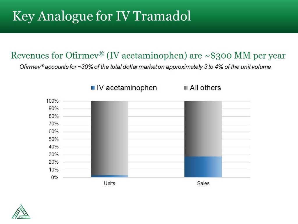 Ofirmev ® accounts for ~30% of the total dollar market on approximately 3 to 4% of the unit volume Key Analogue for IV Tramadol Revenues for Ofirmev ® (IV acetaminophen) are ~$300 MM per year 0% 10% 20% 30% 40% 50% 60% 70% 80% 90% 100% Units Sales IV acetaminophen All others