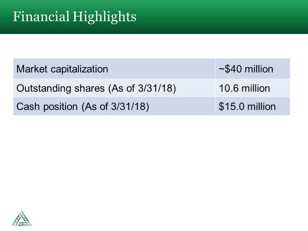 Financial Highlights Market capitalization ~$40 million Outstanding shares (As of 3/31/18) 10.6 million Cash position (As of 3/31/18) $15.0 million