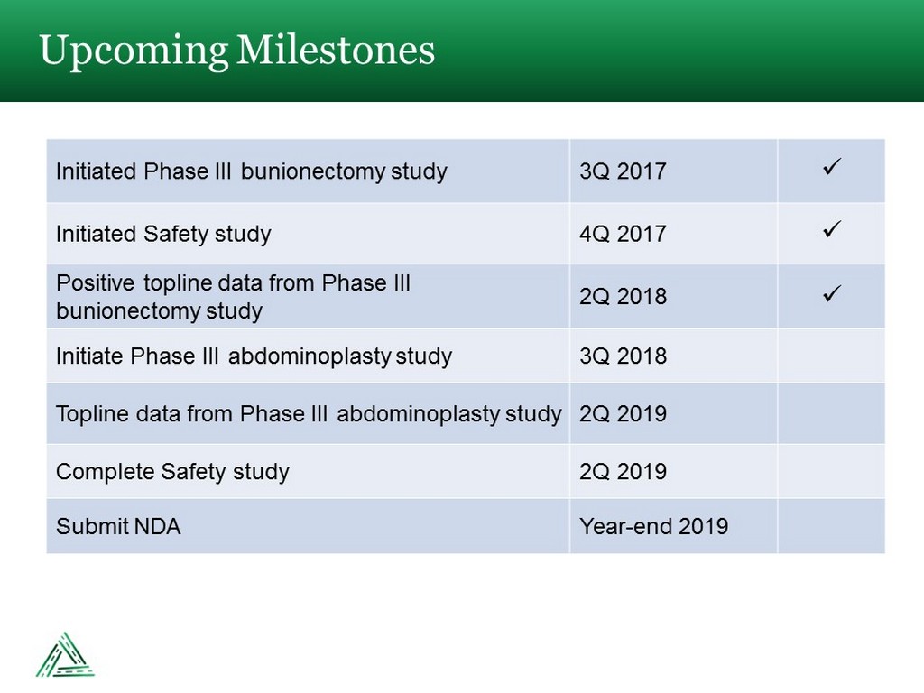 Upcoming Milestones Initiated Phase III bunionectomy study 3Q 2017 x Initiated Safety study 4Q 2017 x Positive topline data from Phase III bunionectomy study 2Q 2018 x Initiate Phase III abdominoplasty study 3Q 2018 Topline data from Phase III abdominoplasty study 2Q 2019 Complete Safety study 2Q 2019 Submit NDA Year - end 2019